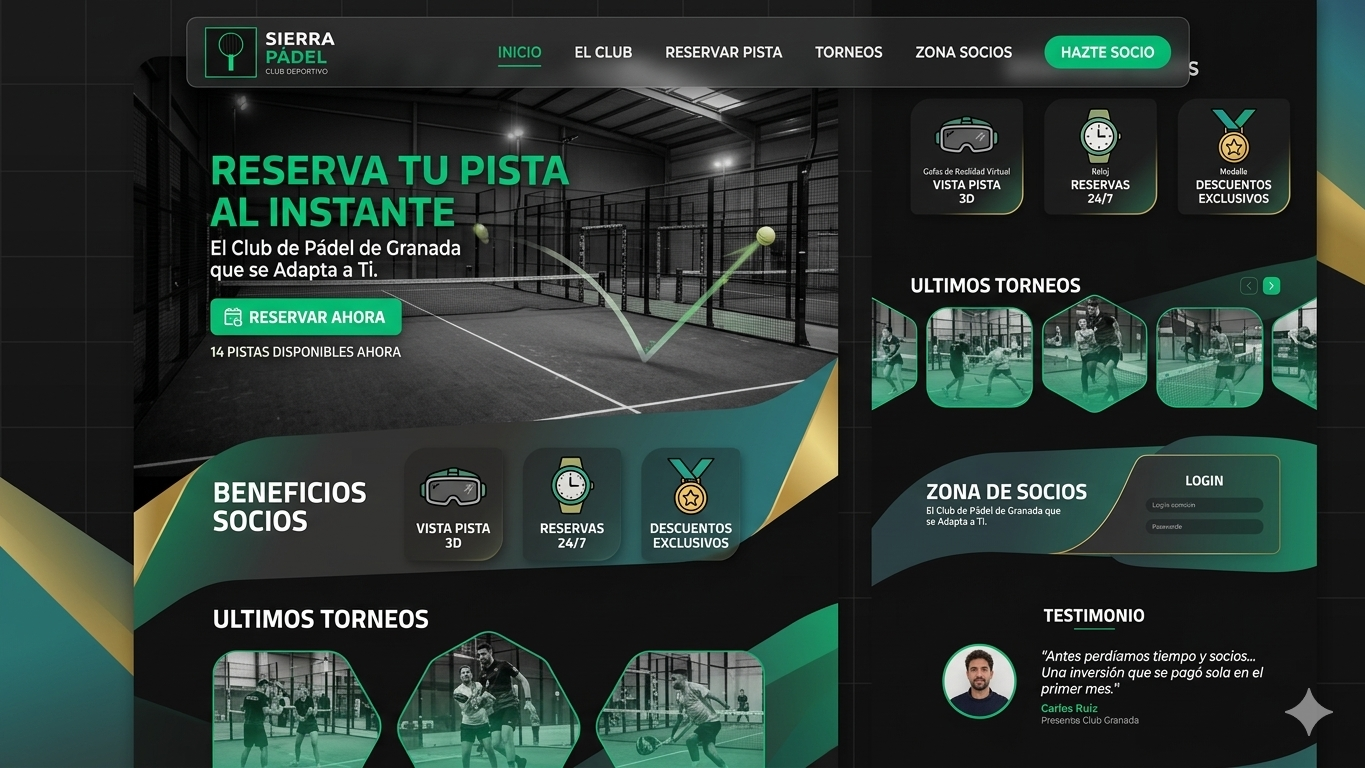 Plataforma web con reservas en tiempo real, área privada de socios con historial y facturas, y galería de torneos para reforzar la comunidad del club.